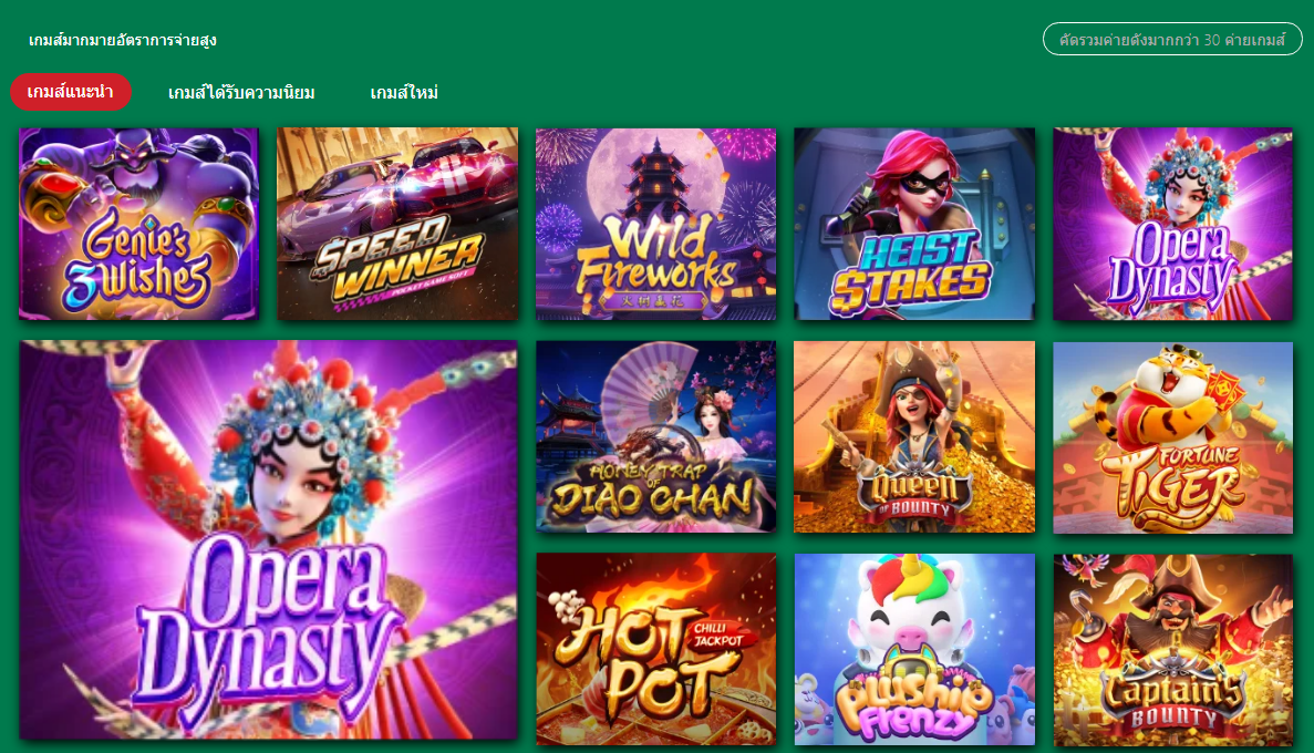 ตอบ: tangsure168 มีเกมสล็อตจากค่ายชั้นนำมากกว่า 30 ค่าย เช่น PG SOFT, PRAGMATIC PLAY, JOKER GAMING, SLOTXO, NETENT, JILI, CQ9 และอื่นๆ อีกมากมาย รวมเกมกว่า 2,500 เกม
